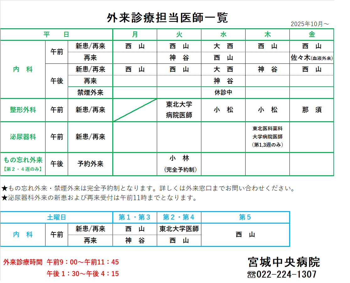 【 内科 月 ~ 土 】 【 整形(午前のみ) 火 ~ 金 】 【 泌尿器 木曜 (午前中) 】 【 物忘れ外来 火曜 (午後のみ)】